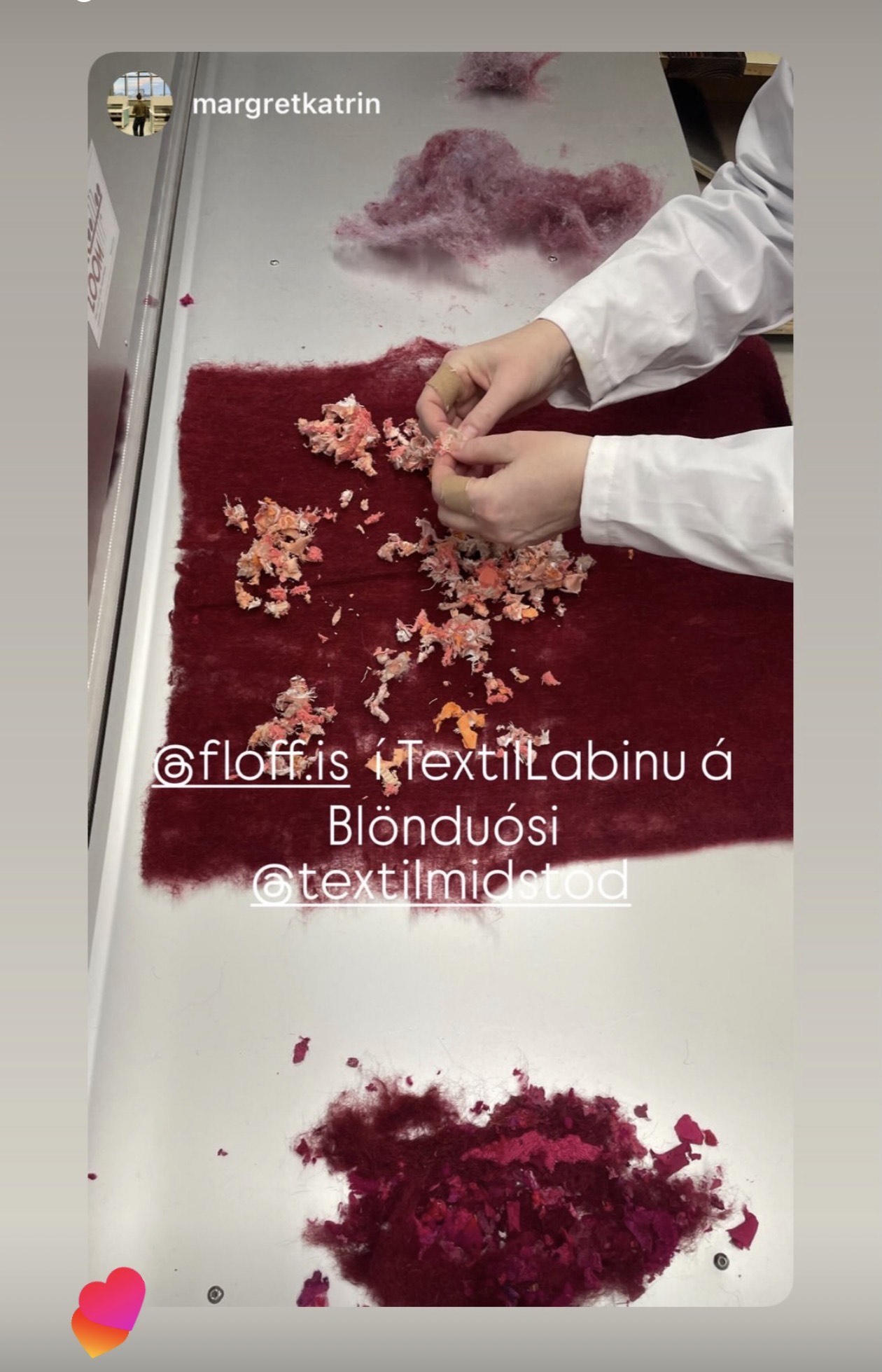 Flöff er fjögurra manna teymi sem sem vinnur með textílúrgang. Undanfarna daga hafa þær Margrét, Sigríður, Ólöf og Sæunn verið að gera tilraunir í TextílLabi, Textílmiðstöðvarinnar. Þær hafa verið að nota kembivélina, hitapressuna og nálaþæfingarvélina til að umbreyta notuðum textíl sem búið er að tæta, í ný efni.